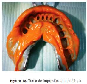 La prótesis parcial removible de acrílico se adaptó a las prótesis fijas ya cementadas. Se tomaron las impresiones definitivas para la confección de la prótesis parcial removible superior e inferior (figura 22, figura 23, figura 24, y figura 25); se procedió a la toma de impresión modificada (figura 26). Seguidamente se procedió a realizar el tratamiento prostodóntico definitivo en el maxilar superior con prótesis fija, con coronas individuales metal cerámica en las piezas 11, 12, 13 y un puente de 21 a 23 del mismo material, prótesis parcial removible de cromo-cobalto superior; en el maxilar inferior prótesis fija, con coronas metal cerámica en las piezas 31, 32, 41, 42, 43 y prótesis parcial removible de cromo cobalto (figura 27, figura 28 y figura 29); finalmente se procedió con los controles periódicos posteriores.