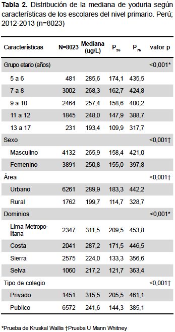 A nivel nacional, la mediana de yoduria fue 258,53 ug/L (P25: 157,15; P75: 408,94) en los escolares, niveles superiores a las necesarias, según lo recomendado por la OMS (Tabla 2).