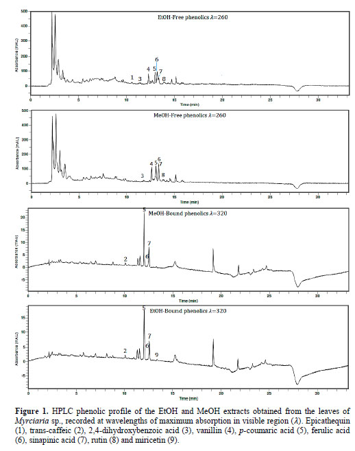 The leaves extract of Myrciaria sp. revealed nine different compounds in the free and bound phenolics extraction, for the peak identification, see Table 3 and Figure 1. Seven of the ten compounds were identified in the extraction for free phenolics: 2,4 dihydroxybenzoic, vanillin,p-coumaric, ferulic, sinapinic acids and rutin in both extracts and the EtOH extract also revealed epicatechin. Even though, the extraction for bound phenolics showed more two different compounds: trans- caffeic and myricetin (EtOH) (Table 3).