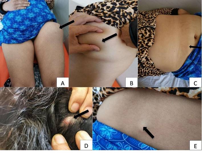 Dos años más tarde, la paciente volvió al servicio refiriendo tumores en la región del muslo izquierdo, la mama y el cuero cabelludo. La exploración física reveló varios tumores duros, uno en la región proximal del muslo izquierdo, otro en el cuadrante superior externo de la mama izquierda. En la exploración abdominal presentaba un aparente tumor hepático que sobrepasaba el reborde costal derecho. Además de múltiples lesiones nodulares en el cuero cabelludo y una en la región lumbar (Figura 1).