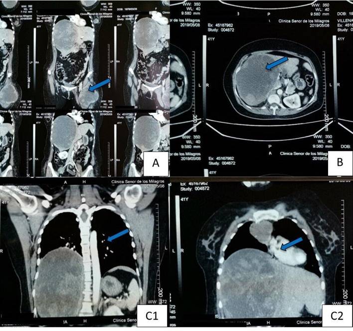 Figura 2 TC. (A) TC de abdomen y muslo que muestra un extenso proceso expansivo en el hígado y muslo derecho proximal con densidad heterogénea relacionada con la metástasis. (B) TC de abdomen que muestra una lesión expansiva heterogénea en hígado. (C1 y C2) TC de tórax que muestra un proceso expansivo en el hígado. (C1) Pequeños nódulos pulmonares (C2) Una lesión expansiva en el mediastino.
