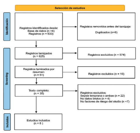 Se encontró un total de 633 estudios. Se removieron 8 duplicados y se revisaron 625 títulos. De estos, se excluyeron 574 títulos y se examinaron 51 resúmenes. De estos, se examinaron 35 registros de texto completo y 8 estudios cumplieron con los criterios de inclusión en esta revisión. Las razones para la exclusión de 27 registros de texto completo fueron: no estudio de factores de riesgo, otro tipo de sepsis, ausencia de factores de riesgo estudiados y falta de data. El proceso de selección de estudios se ilustra en laFigura 1.