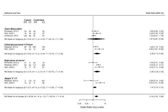 Los factores que aumentaron la probabilidad de sepsis neonatal tardía pero no fueron significativos en el meta-análisis fueron bajo peso al nacer (3 estudios - OR: 2.50 (1.20-5.18); p=0.14; I2 =53%) y Apgar bajo a los 5’ (2 estudios - OR: 1.47 (1.01- 2.13); p=0.32; I2 =18%).