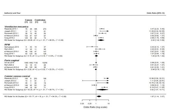 Se estudiaron 4 factores neonatales, 2 factores maternos y 2 procedimientos invasivos asociados a sepsis neonatal tardía. Los factores de riesgo más frecuentemente descritos son ruptura prematura de membranas, uso de catéter venoso central y necesidad de ventilación mecánica (4 estudios cada uno). Se realizó un metaanálisis para un total de 8 factores. Los detalles de los factores incluidos en el metaanálisis se han proporcionado en laTabla 2.