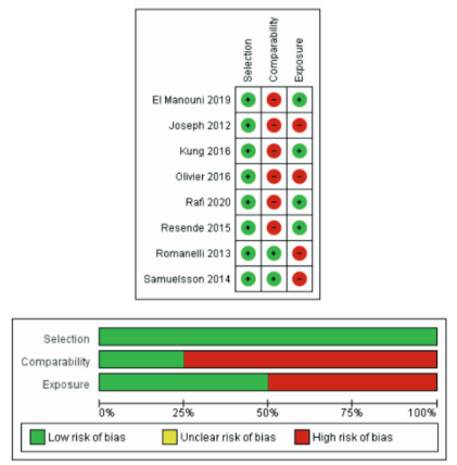 Al realizar una evaluación de la calidad usando la NOS para casos y controles, cuatro estudios fueron calificados como buenos, dos estudios regulares y dos estudios deficientes). La categoría con la calificación más baja fue la “comparabilidad”. Ninguno de los estudios informó el uso de una lista de verificación de informes para describir sus estudios.