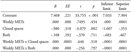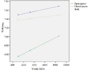 Differences were verified with a medium effect size in the levels of total well-being as a function of the space in which they perform physical activity [F (2, 269) = 8.527; p < .001; M (SD): Closed spaces = 6.7 (1.81), Open spaces = 7.59 (1.22), Both = 7.44 (1.31); f = .24; Post-hoc test: Dunnet’s T3]. Those who did it in open spaces present higher levels of well-being. In order to understand the moderating role of space in the relationship between weekly METs and levels of well-being, a moderation analysis was performed. Table 5 shows the results of the moderation analysis. When comparing the strength of the relationship between weekly METs consumed and the level of total well-being as a function of the space in which the physical activity is performed, it is observed that subjects who perform it in open spaces (either exclusively in open spaces or in open and closed spaces) present higher levels of well-being than those who perform it only in closed spaces. It should be noted that, in all cases, increasing the frequency of weekly physical activity increases the perceived levels of well-being. Figure 1 summarizes the results of moderation.