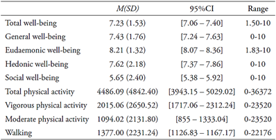 When analyzing the levels of well-being, it was found that the highest mean was concerning personal development and growth, understood as eudaemonic or psychological well-being, and the lowest was the valuation of the circumstances and functioning of society, understood as social well-being. As for the level of physical activity, the subjects were classified according to the weekly METs consumed. The results showed that 13% (n = 40) were placed in the low activity group, 38.3% (n = 118) in the moderate activity group, and 48.7% (n = 150) in the high activity group. Table 1 presents descriptive statistics.