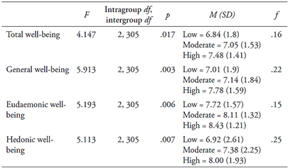 The levels of the different dimensions of well-being were compared based on the number of METs consumed weekly by physical activity. Differences were found in all dimensions of well-being except Social Well-being [(F (2,305) = 0.91; p = .913)]. The results of the tests can be seen in Table 2 (in all cases, the post-hoc test used was Dunnett’s T3). In all cases, subjects classified as highly physically active presented higher levels of well-being.