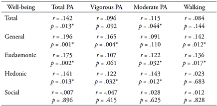 Total METs consumed weekly correlated positively with total, general, eudaemonic, and hedonic well-being dimensions (see Table 3). The vigorous physical activity presented a positive correlation with general and hedonic well-being. The moderate physical activity dimension positively correlated with total, eudaemonic, and hedonic well-being. In turn, the METs consumed weekly in walking were positively correlated with general and eudaemonic well-being. In all cases, the correlation coefficients show a low-intensity association. The levels of social well-being did not show a significant association with any of the dimensions of physical activity.