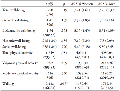 When exploring differences in the levels of well-being and physical activity according to the subjects’ sex, significant differences with a small-medium effect size (d = .27) were only found in the dimension of METs consumed weekly in walking, with men walking more than women. The remaining dimensions of physical activity and none of the dimensions of well-being presented significant differences according to the subjects’ sex (see Table 4).