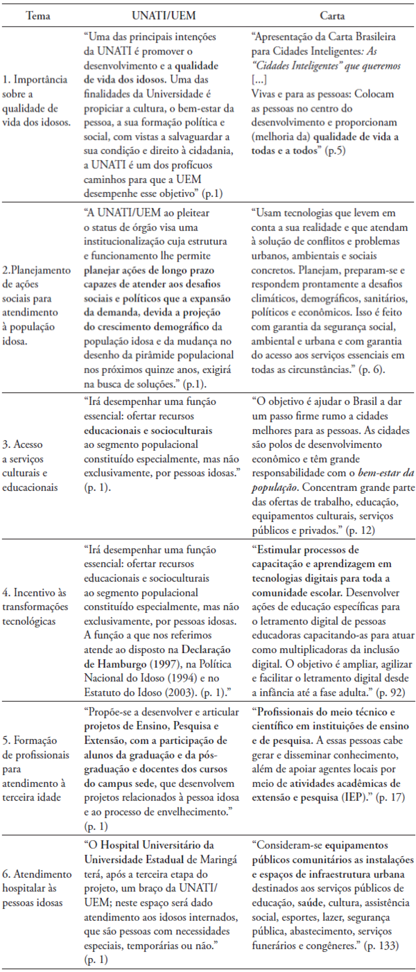Com base na análise comparativa entre a Universidade Aberta à Terceira Idade (UNATI/UEM) e a Carta Brasileira para Cidades Inteligentes, elaboramos o quadro abaixo que evidencia os pontos convergentes (Tabela 1) entre os documentos.