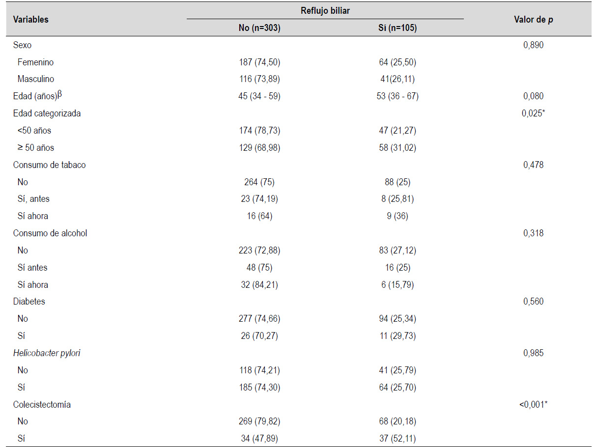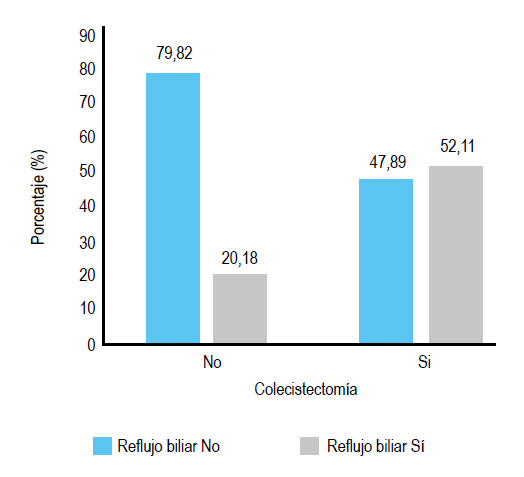 En el análisis bivariado, la prevalencia de RDG en pacientes operados de vesícula fue de 52,11%, mientras que en los no operados fue de 20,18%. Fueron factores asociados a la presencia de reflujo biliar la edad mayor o igual a 50 años (p=0,025) y el antecedente de colecistectomía (p<0,001). Las demás variables no tuvieron diferencia estadísticamente significativa. Tabla 2, Figura 1.