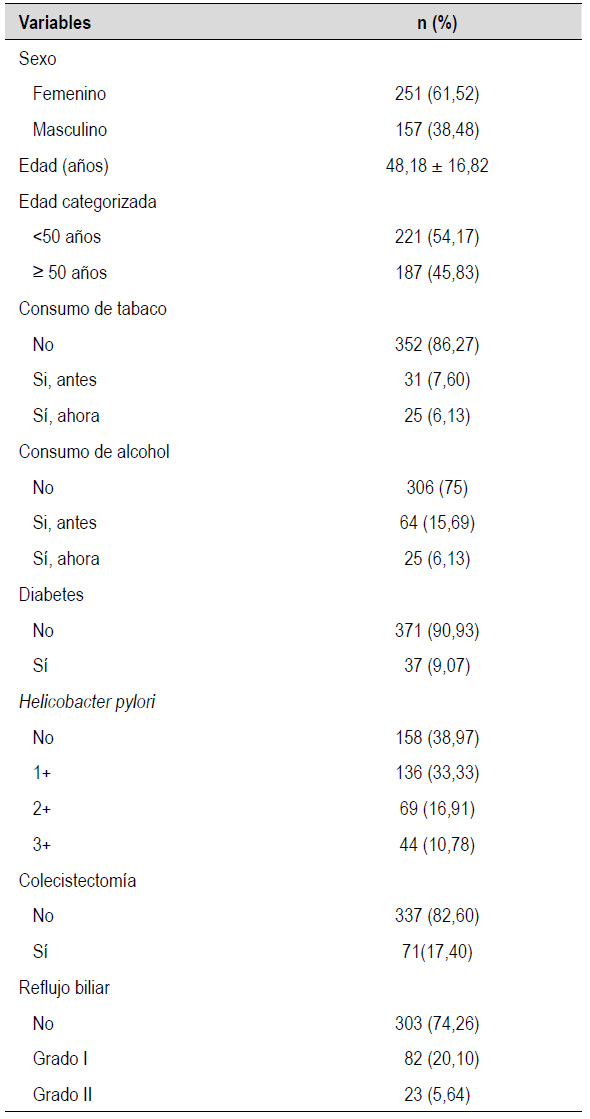 Fueron evaluados inicialmente un total de 448 participantes que se realizaron endoscopía digestiva alta entre febrero y junio del 2023, de los cuales fueron excluidos 40 pacientes por no cumplir con los criterios de inclusión y/o tener al menos un criterio de exclusión, por lo que el grupo de estudio quedó conformado por 408 pacientes. La edad media de la población fue 48,18 ± 16,82 años. Respecto al género, fueron 251 (61,52%) mujeres. De los 408 pacientes estudiados se encontró RDG en 105 (25,74%) y ausencia del mismo en 303 (74,26%). Tuvieron antecedente de colecistectomía 71 (17,40%). El resto de características de la población estudiada se describe en la Tabla 1.