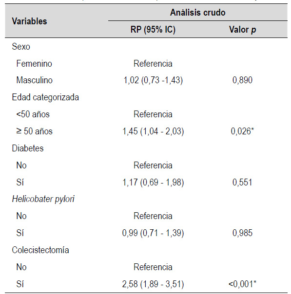 Tabla 2 Análisis bivariado de los factores de riesgo relacionado a reflujo biliar.