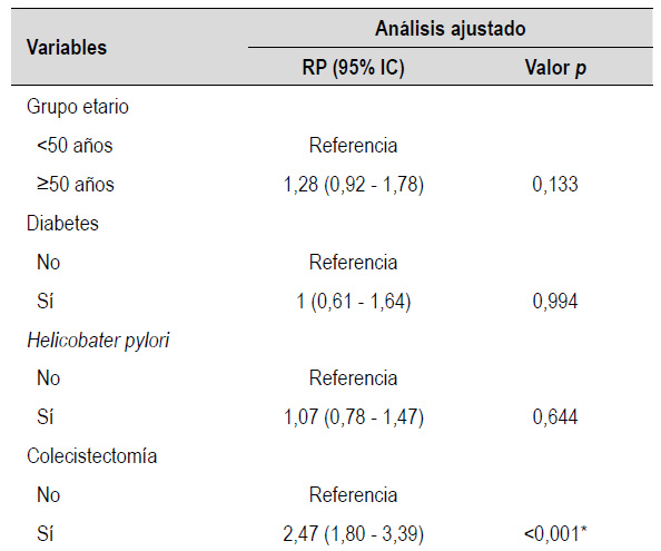 La prevalencia de tener reflujo biliar en pacientes con colecistectomía fue 2,47 veces en comparación a los pacientes sin colecistectomía ajustado por la variable, grupo etario, diabetes y Helicobacter pylori y fue estadísticamente significativo (pp<0,001). Ver Tabla 4.