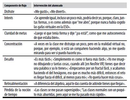 Al concluir las actividades descritas anteriormente, realizamos una entrevista semiestructurada a cada grupo. En ellas hicieron repetidas alusiones a las distintas componentes asociadas a las experiencias de flujo anteriormente mencionadas, vinculadas al uso de NeoTrie VR. En la tabla 1 presentamos algunas intervenciones de los alumnos relacionadas con dichos componentes.