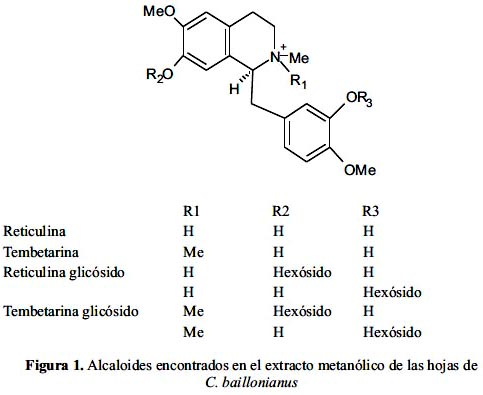 Los alcaloides del núcleo bencilisoquinolínico del extracto metanólico de Croton baillonianus se presenta en la figura 1.