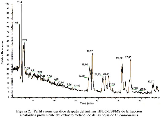 La figura 2 muestra el perfil cromatográfico después del análisis HPLC-ESI/MS de la fracción alcalóidica del extracto metanólico.