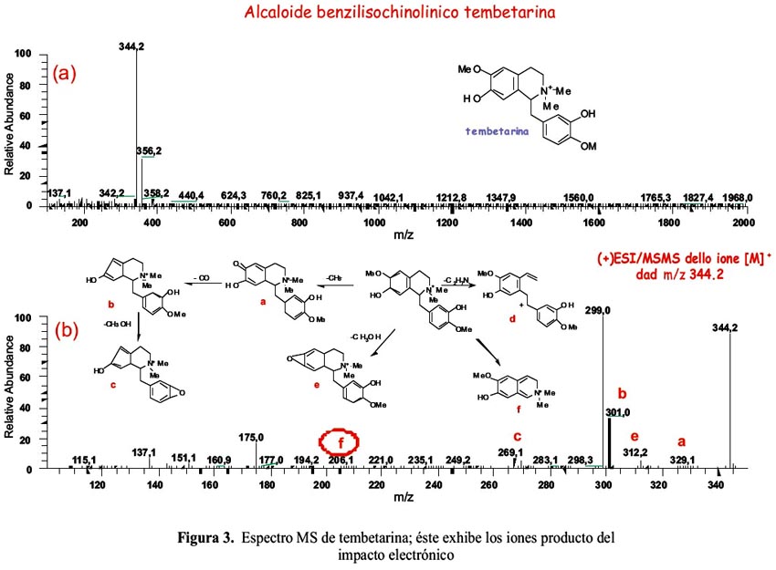El análisis ESI-MS exhibe la señal correspondiente al peso molecular del alcaloide tembetarina; dos señales importantes están constituidas por la pérdida del anillo aromático B (mz / 206.l) y la epoxidación en el anillo aromático A(mz/312.2)