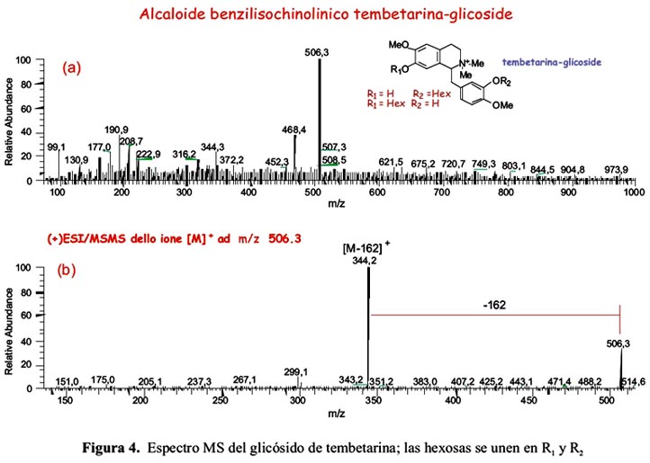 En la figura 3 se presenta el espectro MS de tembetarina, y en la figura 4 el espectro MS del glicósido correspondiente.