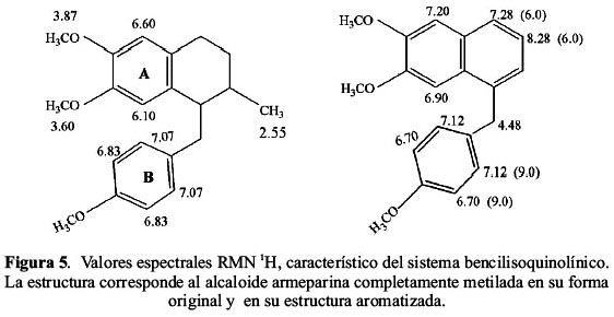 Los datos espectroscópicos RMN 1H concuerdan con el típico sistema del núcleo alcaloidal bencilisoquinolínico (figura. 5)
