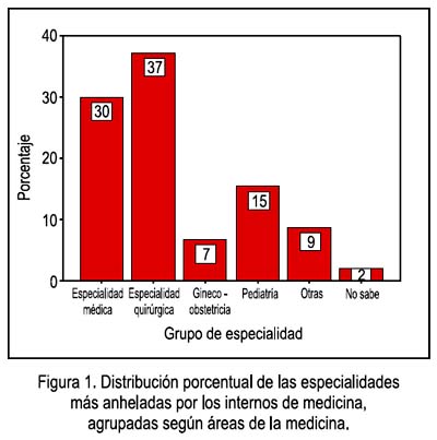 En América Latina se han realizado pocos estudios al respecto. En los años 60, el médico argentino Juan César García analizó el proceso de especialización en 6 escuelas de medicina de América Latina, encontrando que al inicio de los estudios de medicina ya 52% de los estudiantes tenía en mente una determinada especialidad, mientras que al final de sus estudios esta decisión llegó al 66%. Un estudio más reciente realizado en Argentina, en el año 2001, halló que los jóvenes que se decidieron por medicina expresaban su intención por especializarse desde su ingreso a la carrera (74%) hasta el fin de ella (100%), siendo las especialidades quirúrgicas las más anheladas (28). La información obtenida en el presente estudio obedece a la realidad de cómo están distribuidos los recursos humanos en salud por especialidad. Los médicos especialistas presentaron un aumento en los últimos 15 años; para el año 2004, el Colegio Médico del Perú registró 19 479 especialistas. La mayor cantidad de especialistas registrados corresponde a las denominadas especialidades básicas: ginecoobstetricia (2 008), pediatría (1 841), cirugía general (1 429), medicina interna (1 349), anestesiología (874) y oftalmología (666) (29).