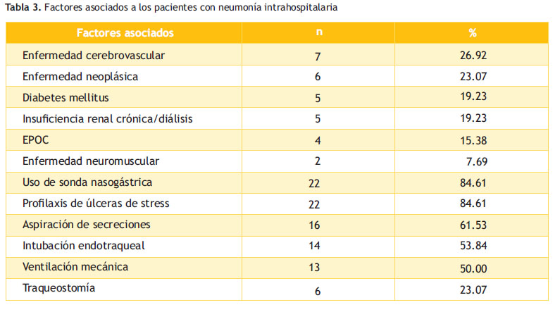 La patología más frecuentemente asociada a NIH fue la enfermedad cerebrovascular con 7 pacientes 26.92%, seguido de la enfermedad neoplásica con 6 pacientes 23.07%. La diabetes mellitus se presentó en 5 pacientes 19.23% y la insuficiencia renal crónica en 5 pacientes 19.23%. Los factores extrínsecos más frecuentemente encontrados fueron la presencia de profilaxis de úlceras de stress con 22 pacientes 84.61% y la presencia de sonda nasogástrica con 22 pacientes 84.61%. Se encontró 16 pacientes 61.53% a quienes se les realizó aspiración de secreciones bronquiales, 14 pacientes 53.84% con intubación endotraqueal, 13 pacientes 50% ingresaron a ventilación mecánica y 6 pacientes 23.07% fueron sometidos a traqueostomía (Tabla 3).