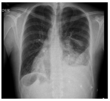 Figura 1 Radiografia de tórax: infiltrados intersticiales gruesos parahiliares bilaterales con área de opacidad alveolar confluente en lóbulo inferior izquierdo, con derrame pleural y signos de pérdida volumen con retracción del hemidiafragma y atelectasia parcial de la língula, mas hallazgo incidental de dextrocardia