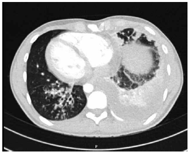 Adicionalmente, se solicitó tomografía de tórax con protocolo para tromboembolismo pulmonar el cual descartó el mismo; Sin embargo, se evidenció derrame pleural tabicado en lóbulo inferior izquierdo con opacidades alveolares e infiltrados intersticiales peribroncovasculares con engrosamiento de septos interlobulillares. Además, con bronquiectasias cilíndricas, algunas con tapón mucoso (Fig.2). Se realizó toracentesis diagnóstica con evidencia de líquido pleural exudativo, neutrofílico compatible con derrame pleural complicado (LDH >1000, Glucosa <40). Se llevó a decorticación pulmonar sin complicaciones, con estudios de PCR para Mycobacterium tuberculosis y cultivo de gérmenes aerobios y anaerobios negativos.