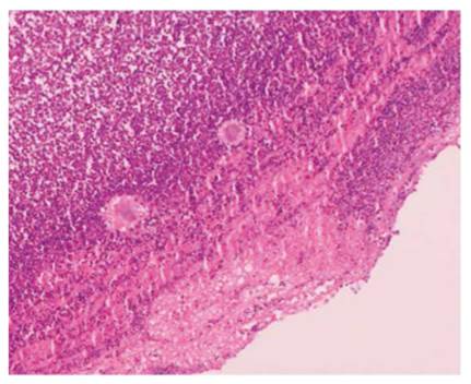 Figura 3 Coloración de Hematoxilina-eosina, aumento 10X. Líquido pleural con proceso inflamatorio agudo severo y presencia de estructuras redondeadas por bacterias “Signo gránulos de azufre”