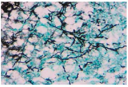 Figura 4 Coloración de Grocott, tinción de Ziehl-Neelsen negativa. Evidencia de bacterias filamentosas.