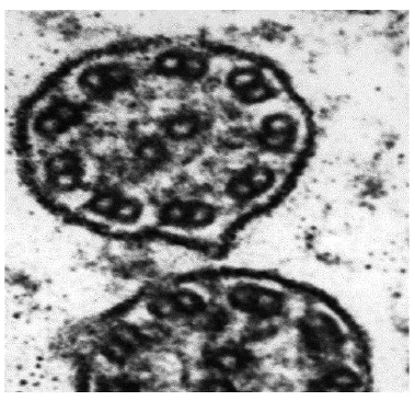 Dentro del estudio de dextrocardia y hallazgos de bronquiectasia, previamente no conocida, se iniciaron estudios con biopsia de ciliar de mucosa nasal, que posteriormente mostró cambios ultraestructurales de discinesia ciliar primaria dados por ausencia de brazos de dineina confirmándose el diagnóstico de síndrome de Kartagener. (Fig. 5)
