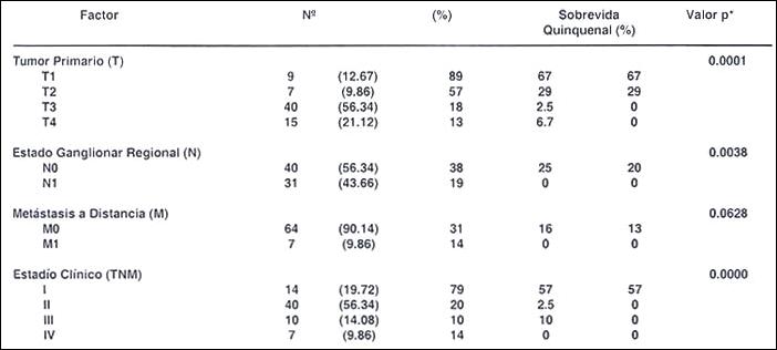 Factores pronósticos de sobrevida. En el análisis univariado, usando el test de Log-Rank, las siguientes variables estuvieron asociados significativamente con la sobrevida quinquenal: tumor primario (p= 0.0001), estado ganglionar regional (p= 0.0038), estadío clínico (p= 0.0001). Así, el tumor primario T 1 , estado ganglionar regional NO, estadío clínico I tuvieron mejor sobrevida comparado con aquellos pacientes que tuvieron tumor primario T2 T4; metástasis ganglionares regionales N1 y estadíos clínicos II-III-IV. Otro factor evaluado como la metástasis a distancia M, no alcanzó significancia estadística con rela ción a la sobrevida actuarial quinquenal (Cuadro 1).