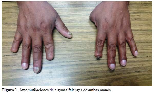 Desde los 29 años el paciente comenzó a manifestar impulsos irresistibles de automutilación; en un período de 8 meses comenzó a mutilarse las falanges de ambas manos (Figura 1), presentó alucinaciones auditivas peyorativas e imperativas, refirió que fueron órdenes de “Papá pitufo” y “Gárgamel”; y que si no cumplía dichas órdenes “las voces le harían daño”, por lo que comenzó a cortarse con un cuchillo la primera falange del primer dedo de la mano izquierda, luego las falanges distales de los dedos 2° y 5° de la mano derecha y finalmente la falange distal del 2° dedo de la mano izquierda. La madre nos refirió que durante estos 8 meses el paciente frecuentemente se escapaba de su casa, para luego encontrarlo deambulando por la vía pública con la mano ensangrentada producto de la automutilación: le llamó la atención que el paciente no expresara sensación de dolor. En cada uno de estos episodios de automutilación, el paciente fue atendidoen un hospital general; las mutilaciones fueron completas por lo que no requirieron de intervención quirúrgica secundaria.