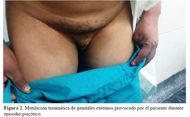 La madre refirió que, en agosto del 2014, el paciente se acercó a ella con el pantalón ensangrentado en la zona inguinal, aunque llamaba la atención que no se quejase de dolor. La madre se percató de que el paciente se había mutilado el pene y los testículos (Figura 2), motivo por el cual acudieron al servicio de emergencia de nuestro hospital. Se logró controlar el choque hipovolémico hemorrágico mediante hemostasia local y fluidoterapia, para luego pasar a sala de operaciones de urología, donde se le realizó un control y revisión de hemostasia, además de la creación de uretra perineal. Luego de permanecer 11 días en el servicio de urología se decidió la transferencia al servicio de psiquiatría general. Se evidenció conducta alucinatoria, el paciente refirió que fueron 4 voces las que le indicaron que se corte los genitales. Después de un mes de hospitalización se logró controlar parcialmente los síntomas psicóticos con clozapina 450 mg/día y quetiapina 50 mg/día. Durante sus controles por consulta externa se llegó a alcanzar una dosis de clozapina de 800 mg/día y valproato de sodio 1 g/día.