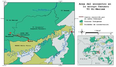 Antes de la homologación de la Tierra Indígena Hi-Merimã, en 2005, la región estaba ocupada por familias de caucheros y patrones del caucho que habían migrado del Nordeste brasileño hace casi un siglo. Algunas estaban asentadas próximas a las áreas de uso indígena y a menudo los senderos de ambos se cruzaban y así se producían los contactos imprevistos. La convivencia en un territorio que empezó a ser compartido estaba basada en la desconfianza mutua que imponía el distanciamiento y la vigilancia constante de los desplazamientos de cada grupo. Mantener una buena distancia se hizo imprescindible para las familias desposeídas de su libertad en los senderos, ahora utilizados por trabajadores del caucho. La narrativa transcrita a continuación (registrada en 2015) ilustra la complejidad de las dinámicas territoriales objeto de análisis del presente texto.
