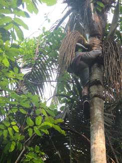 Figura 4. Mamatafo (Deguelia urucu) a la izquierda y patabá (Oenocarpus bataua) a la derecha de la foto en las orillas de la quebrada Canuaru