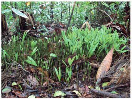Figura 6. Plántulas de patabá (Oenocarpus bataua) cerca de un campamento de los hi-merimã