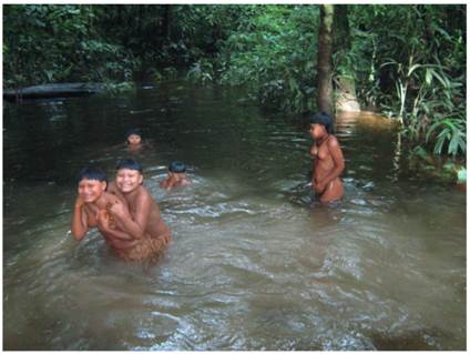 Estaba todo muy en calma. La mujer menor tarareaba una canción en voz baja en su lengua mientras amamantaba al niño. La otra mujer se mantuvo de pie a mi lado. Ella miraba y hablaba unas cosas con la mujer mayor. Carlinhos se sentó un poco apartado, mirándonos. Después de un rato de silencio las mujeres volvieron a charlar. Una de ellas, la menor, que no amamantaba, cogió la mitad de la papa, puso la envira en la cabeza y luego siguió por el camino que habíamos recorrido para llegar allí. Carlinhos hizo un gesto de mano para mí. Me dijo que siguiéramos nuestro camino. Cogimos las escopetas, nuestro pez, y seguimos nuestro camino por la ribera del Canuaru. Las mujeres nos siguieron por algunos minutos. La otra mitad de la papa se quedó allí. En cierto momento las mujeres hablaron entre sí. La mujer que llevaba el niño también decidió regresar. La mujer mayor gesticuló para nosotros. Creo que ella quería que las acompañáramos al lugar en donde estaban los otros de su grupo. Hacia la misma dirección en donde habíamos escuchado el bullicio de los indios charlando hace algún tiempo. Señalé el sol y seguí con la mano su movimiento. Intenté explicarle que íbamos a volver en tres días. Así seguimos nuestro camino. Después de unos minutos notamos que la mujer nos seguía. Nos acompañó durante mucho tiempo. A veces ella se quedaba atrás. Cuando volvía a acercarse a nosotros, llevaba unas ramas y hojas. En algún momento estaba toda pintada. Tenía la boca y las manos coloreadas con pintura morada [nota 7]. No entendíamos por qué ella nos seguía.