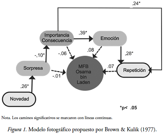 Aunque los modelos plantean relaciones diferentes entre las variables, se pueden encontrar algunas regularidades (Luminet & Curci, 2009). En la formación de una FBM siempre se encuentra implicada la reacción de sorpresa; hay una evaluación cognitiva de su importancia/consecuencia para el individuo; la intensidad de las reacciones emocionales juega un papel fundamental y por último el aspecto de las conductas de recuento abiertas (conversaciones) y encubiertas (pensamientos) influye directa o indirectamente en la FBM. Nuestro objetivo principal fue estudiar la formación de Recuerdos Flashbulb (FBM) en población colombiana a través de una noticia de trascendencia mundial: la muerte de Osama bin Laden. Estudios previos (Finkenauer et al., 1998; Luminet & Curci, 2009) han mostrado que el modelo de Finkenauer et al. (1998), se ajusta mejor a la explicación de la formación de una FBM. Nuestra hipótesis inicial es que este modelo explicará la formación de una FBM en población colombiana. Además, dado que Er (2003) propuso un modelo para no implicados (en este caso puede considerarse que los participantes cumplen esta condición), este modelo debe tener unos índices aceptables para explicar la formación de dichos recuerdos.