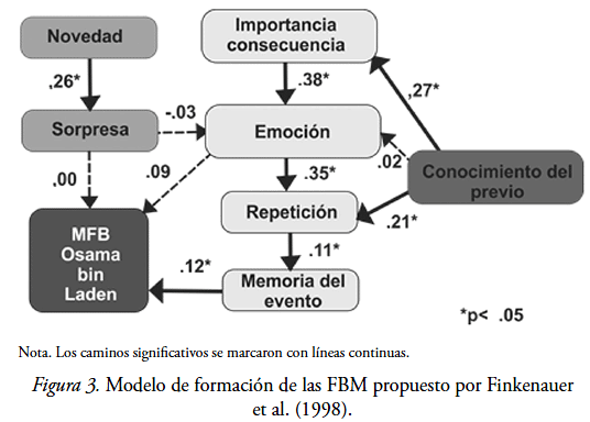 Nuestros resultados de la prueba de este modelo son muy similares a los encontrados en la prueba del modelo de Finkenauer et al. (1998). El camino directo de formación que va de la Novedad/sorpresa vía la emoción, no se encontró significativo para la formación de la FBM. El camino indirecto, que implica la evaluación cognitiva de la importancia del evento que activa una respuesta emocional que a su vez lleva a una activa repetición y búsqueda de información sobre el hecho y de allí a una consolidación de la memoria del evento, siendo esta última la predictora directa de la formación de la FBM, fue significativo. Dos de los tres caminos que surgen de la variable predictora Actitudes se hallaron como significativos. Solo el camino que va de las Actitudes a la Emoción no lo fue.