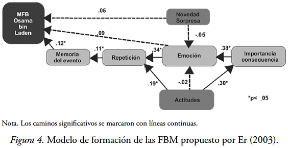 En el cuarto modelo, Er (2003), investigó la formación de FBM en personas que vivieron el terremoto de Turquía en 1999 (grupo de víctimas o personas con alta implicación y personas que solamente escucharon acerca de él a través de los medios (grupo de no víctimas o baja implicación). Este autor sugiere que los recuerdos del grupo de mayor implicación, son diferentes de los de aquellos que no vivieron la experiencia de forma directa. Por lo tanto, dos modelos estructurales son necesarios para entender la formación de la FBM (Er, 2003). La diferencia más importante entre los modelos anteriores y el nuevo modelo de Er (2003), fue encontrar que en los sujetos que habían vivido el evento directamente, la ME no se diferenciaba de los recuerdos de recepción del contexto. Esto es, la FBM es equivalente a la ME (Er, 2003). Asimismo, del análisis estructural surgió un camino directo de la evaluación de la importancia/consecuencia hacia la FBM, hecho que contradice los postulados de los modelos anteriores, donde la relación es indirecta. Entre tanto, el modelo para el grupo de recepción indirecta se asemeja al planteado por Finkenauer et al. (1998).