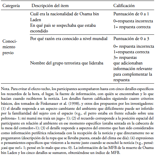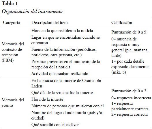 FBM de la muerte de Osama bin Laden. La hora en que se recibió la noticia tuvo una media de .93 (DE = .26). El lugar en que se encontraban los participantes tuvo una media de .95 (DE = .22). Los participantes también recordaban el medio de información (M = .96; DE = .195), las personas que acompañaban al participante (M = .92; DE = .27) y la actividad que realizaban (M = .94; DE = .24).
