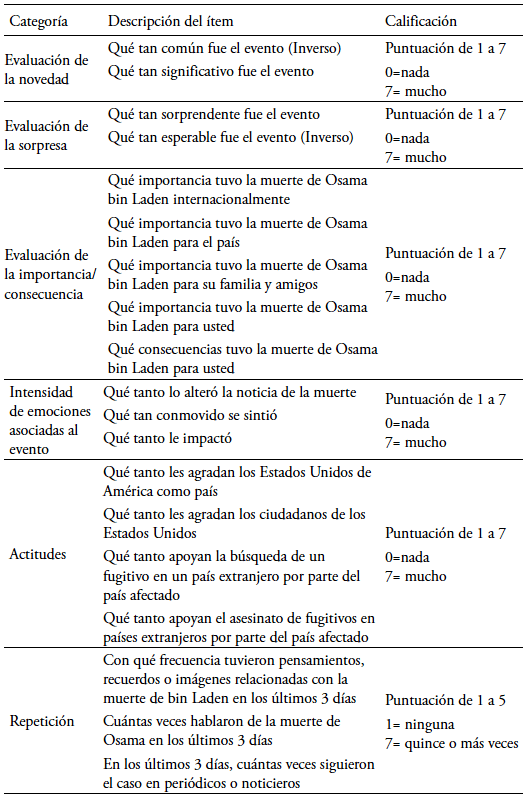 En contraste, la variable Sorpresa es descrita por los participantes en un nivel medio (M = 4.21; DE = 2.32), lo que indica que la muerte de Osama bin Laden era esperable.