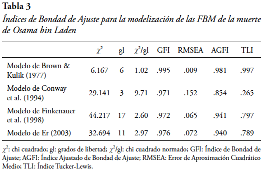 El principal hallazgo de esta investigación es que el modelo de Finkenauer et al. (1998) se ajustó de manera satisfactoria a los datos provenientes de población colombiana relacionados con la formación de la FBM de la muerte de Osama bin Laden, comparado con los modelos restantes, tal y como se planteaba en nuestra hipótesis.