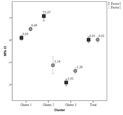 El resultado del análisis de clúster permitió determinar la existencia de una buena segmentación (MSCSC=0.6) conformada por 3 agrupaciones; siendo la primera de ellas la más grande, de forma significativa, con una diferencia grande y estadísticamente potente (p=72.38%; χ² p =.00; ω=.82; 1-β=1.00); seguido por la segunda (p=15.71%; Z=11.70) y la tercera (p=11.90%; Z=12.55).