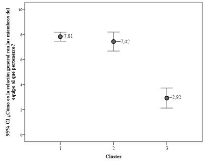 En la Figura 2, se observa que el Clúster 3, es significativamente menor en la variable criterio, comparado con el grado en que se valora la relación general con los miembros del equipo al que el deportista pertenece es extremadamente buena. Finalmente, no se encontraron diferencias estadísticamente significativas en los factores del modelo 2.1 con respecto a las variables sociodemográficas o deportivas analizadas, los tamaños del efecto fueron pequeños y sin potencia estadística.