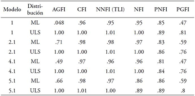 Los modelos 2.2, 4.2 y 5.2 fueron rechazados porque su matriz PSI no estaba definida positivamente en ML y en ULS, trayendo como consecuencia que la varianza de error fuese negativa en el Factor 1 del modelo 2.2, tanto para ML (Errovar F1 = -2.01) como para ULS (Errorvar F1 = -.20); en el Factor 1 (ErrovarF1= -.024) y en Factor 5 (ErrorvarF5= -.014) del modelo 4.2 de ML y para el Factor 1 (Errorvar F1 =-.026), el Factor 3 (Errorrvar F3 =-.017) y el Factor 5 (Errorvar F5 =-.015) del modelo 4.2 de ULS. En el Factor 1 de ML del modelo 5.2 (Errorvar F1 = -2.01) y de ULS (Errovar F1 =-.20). También se ­rechazaron porque en todos ellos la matriz de covarianza tampoco estaba definida positivamente. De los restantes modelos evaluados, en la Tabla 1, se presentan los indicadores de ajuste absoluto y en la Tabla 2, los de ajuste incremental y parsimonia, respectivamente.