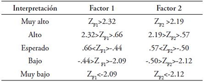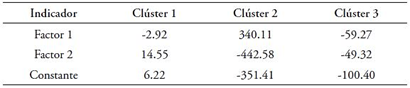 De acuerdo con la Figura 1, en el Clúster 1 se puede observar que el puntaje del Factor1 es similar a lo esperado en la distribución Total, mientras que, en el Factor2 los puntajes son significativamente mayores a lo esperado en la distribución Total. En el Clúster 2, se puede observar que los puntajes del Factor1, se encuentra significativamente más alto que en la distribución Total, mientras que, en el Factor2 la distribución es significativamente más baja. Finalmente, en el Clúster 3, los puntajes son significativamente más bajos en ambos factores, comparado con la distribución Total. En la Tabla 5, se presentan los parámetros para la clasificación de los deportistas en uno de los tres clústeres obtenidos, mediante una ecuación de regresión logística multinomial, la cual tuvo un 100% de correcta clasificación y que es mucho más fácil de aplicar que el método de distancias original del clúster aplicado.