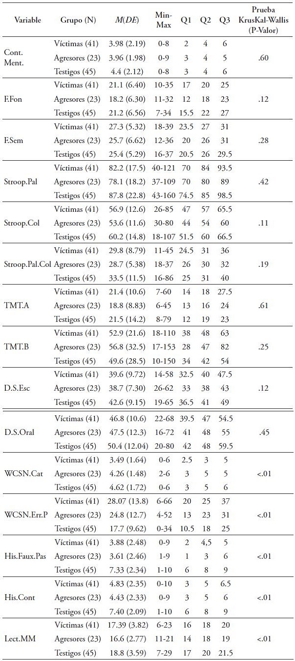 Respecto a las pruebas de cognición social, también se encuentran diferencias estadísticamente significativas entre los grupos, obteniendo resultados más bajos el grupo de agresores, seguido por el de víctimas y testigos, teniendo en cuenta los resultados de la prueba de Faux Pas Historias en donde los testigos obtuvieron 7.33 (DE=2.34), en comparación con el grupo de Agresores que obtuvo 3.61 (DE=2.46) y Víctimas 3.88 (DE=2.48) y el Faux Pas Control en donde el grupo de Testigos registro una puntación de 7.40 (DE=2.09), los Agresores 4.43 (DE=2.33) y las Víctimas 4.83 (DE=2.35). En la prueba de Lectura mental de la mirada el comportamiento fue similar, en esta el grupo de Testigos presentó una puntuación mayor 18.8 (DE=3.59) en contraste con el grupo de Agresores 16.6 (DE=2.77) y las Víctimas con 17.39 (DE=3.82) (Ver Tabla 2).
